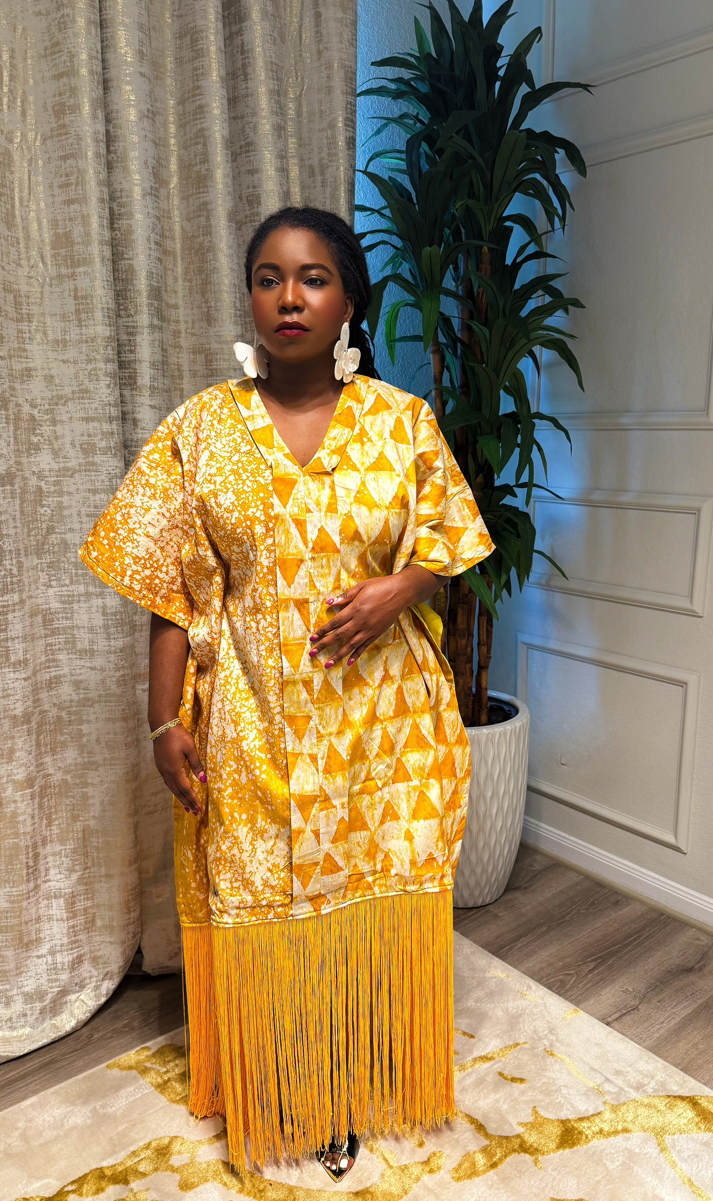 Introducing Khadija — A sophisticated and stylish garment sure to leave an unforgettable impression. This intricate fusion of Adire wax and woven aso-oke on the neckline, combined with the free-flowing elegance of the dress gives you an aura of sophistication and confidence. The double-layered fringe trim at the bottom adds a touch of playfulness, making you feel and look like a modern-day queen. With precious side pockets seemingly crafted for convenient access throughout any sojourn or ceremony, you will experience true freedom each time that this bubu graces your body. Step out into memorable moments donning this extraordinary fashion statement filled with the strong sentiment from indigenous roots passed down through generations.
